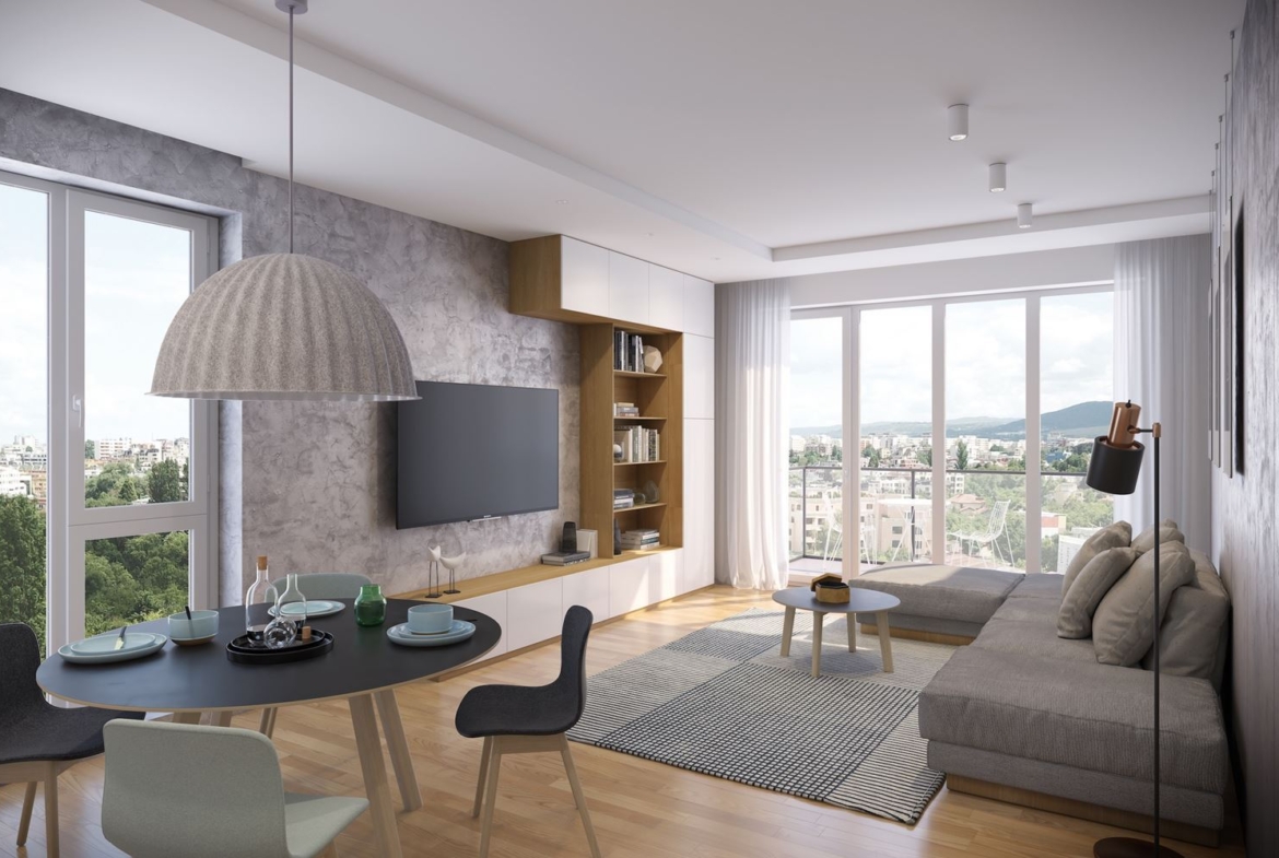 Предава се на шпакловка и замазка с блиндирана входна врата, висококачествена дограма, ВиК на тапи, ел. инсталация с монтирани табла, изградена система за TV и интернет, инсталацията за отводняване на климатичните тела и газовите котли включена в канализационната система на сградата и Smart home система.