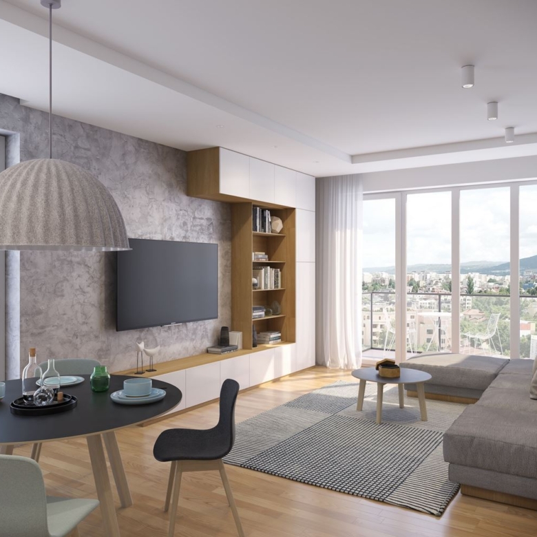 Състои се от дневна с трапезария и кухненски кът 36 м ², тераса към дневната 5 м², спалня 15 м² с баня, втора спалня 14 м², втора баня с тоалетна, мокро помещение и просторно входно антре. Отоплението е с централна вентилационна система и кондензни стенни водогрейни двуконтурни газови котли или индивидуални термопомпи въздух-въздух. Изложението е юг-север.