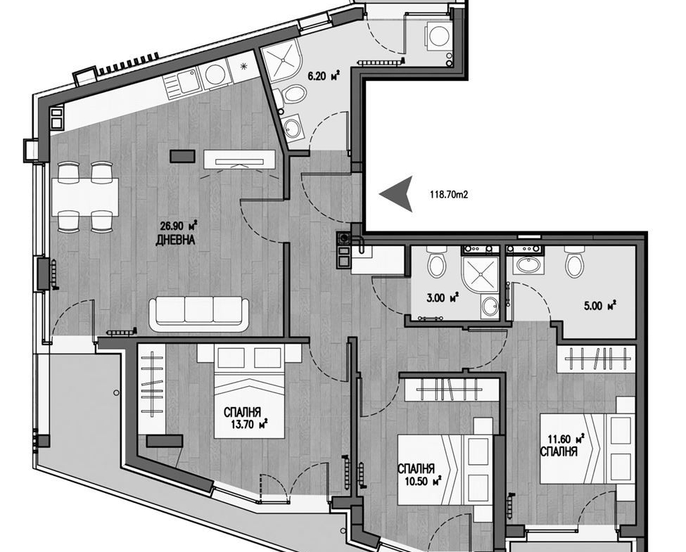 Състои се дневна с трапезария и кухненски кът 26.90 м², спалня 11.60 м² с баня и тераса, две спални по 10.50 м² и 13.70 м², обща тераса към дневната и двете спални, още две бани с тоалетна – едната с мокро помещение, входно антре и складово помещение в сутерена.